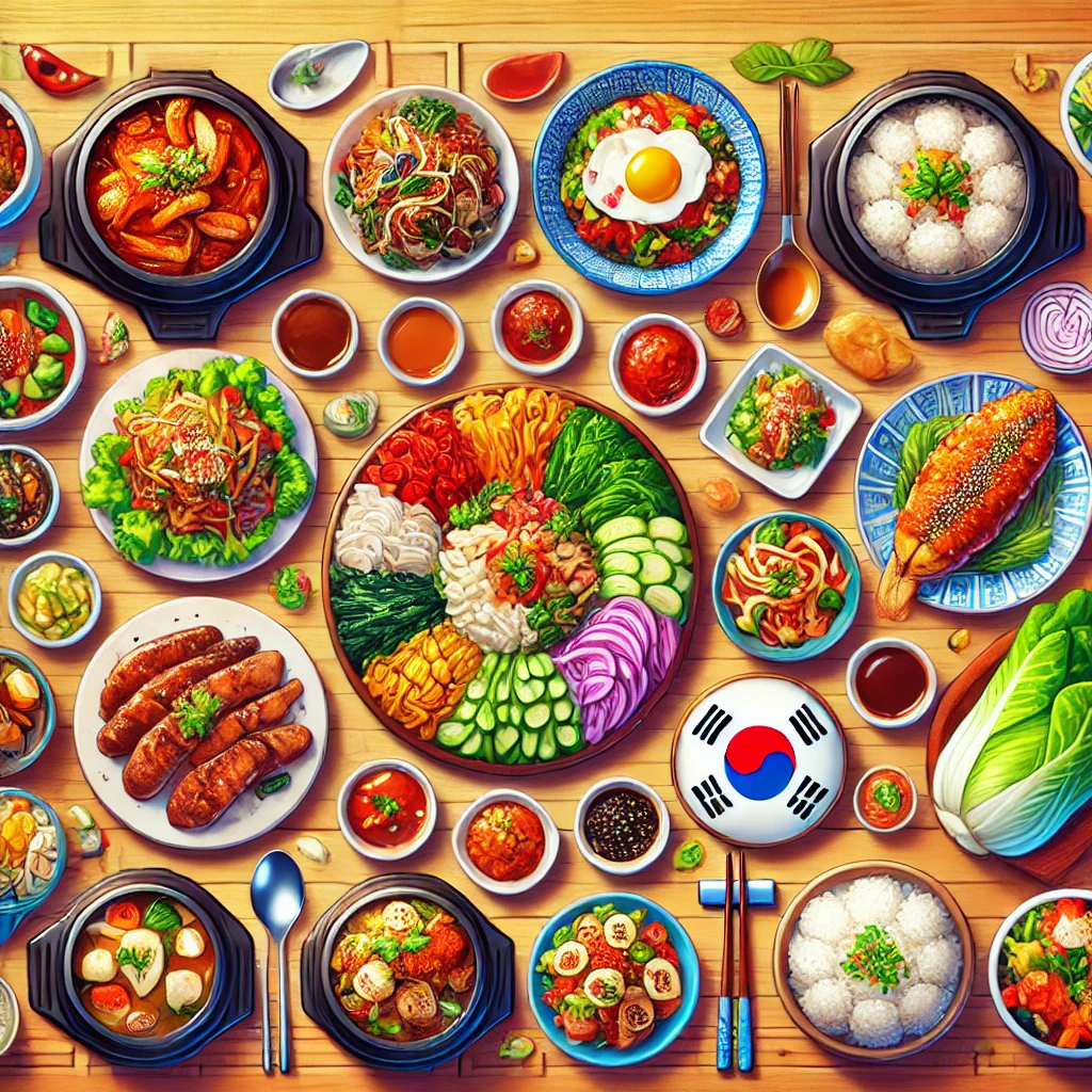 '여기 한국 음식을 대표하는 이미지를 그려봤습니다. 다양한 전통 한식인 비빔밥, 불고기, 떡볶이, 잡채와 함께 김치와 여러 가지 반찬들이 따뜻하고 풍성하게 차려진 장면이 담겨 있습니다.'